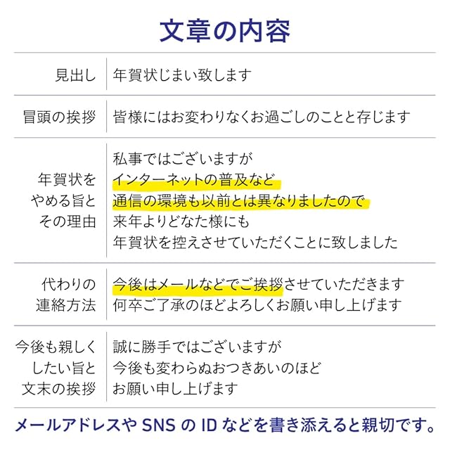通信環境の変化を理由に年賀状をやめて年賀状は辞めて、今後は年賀状とは別の形でお付き合いを続けていきたい、という内容の文章になります。