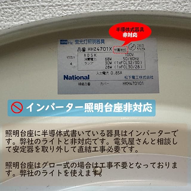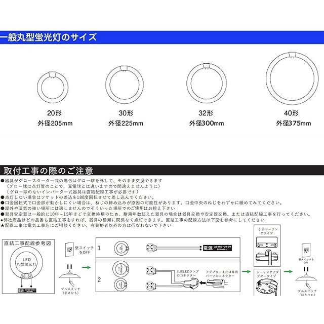 【取付方法】:グロー式の灯具はグロー球を外すだけで使用可能(ラピッド式、インバーター式は必ず配線工事が必要)※器具年数長い場合、安定器劣化の原因で不具合が出る場合があり、この場合は直結の結線方法をおすすめます。