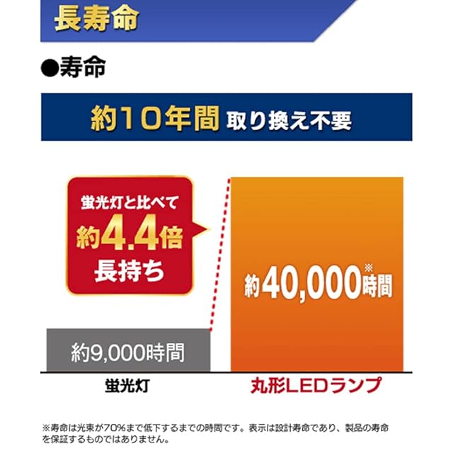 【長寿命】:寿命は蛍光灯の約4~8倍で遥かに長寿命!交換する頻度が少なくて済みます!点灯消灯を繰り返しても寿命に影響無し。