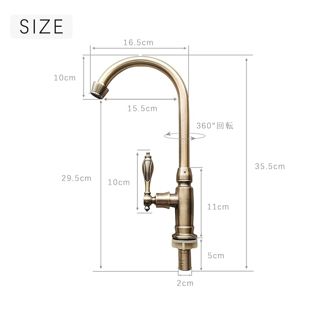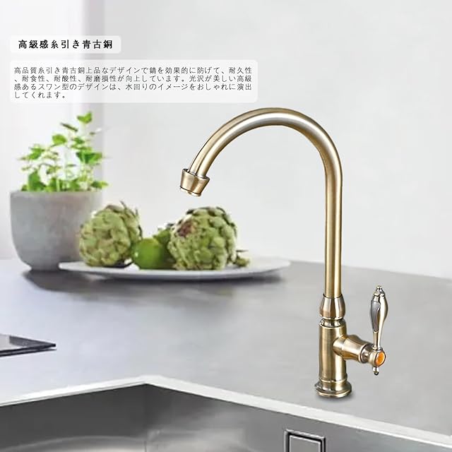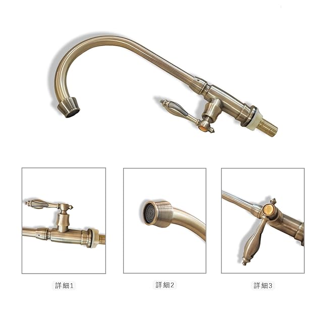 蛇口が360°回転しますので、とても使い勝手がいい単水栓です! アンティーク調の気品とレトロなデザインがオシャレで古風な風格がとても素敵なバスルーム・洗面用の単水栓です! ドッシリとした風格あるアンティーク調のデザイン、懐かしさとレトロな時間と空間を演出してくれます。 設置サイズ:高さ/325mm 吐水口長さ/165mm 吐水口高さ/255mm 取り付けネジ径/20mm 取り付けネジ長さ/48mm