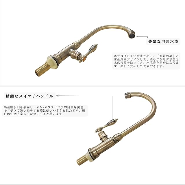 蛇口が360°回転しますので、とても使い勝手がいい単水栓です! アンティーク調の気品とレトロなデザインがオシャレで古風な風格がとても素敵なバスルーム・洗面用の単水栓です! ドッシリとした風格あるアンティーク調のデザイン、懐かしさとレトロな時間と空間を演出してくれます。