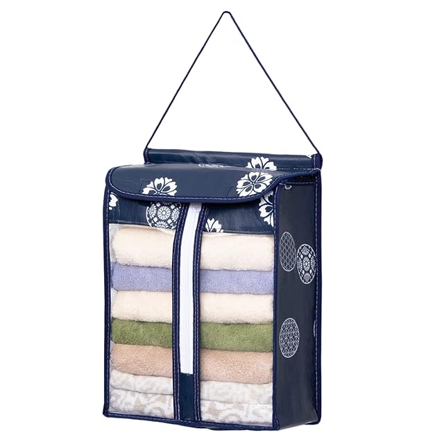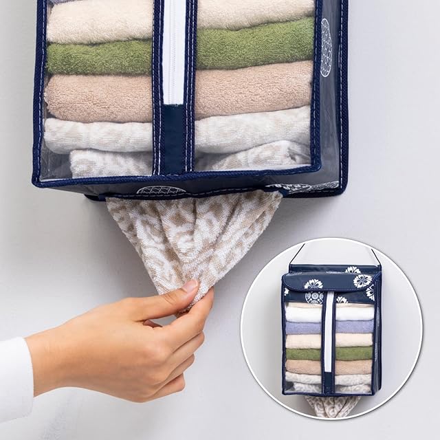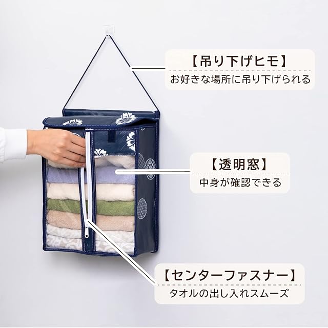 商品名:アストロ タオル 収納ケース ネイビー 和モダン柄 ラミネート加工 撥水 タオルストッカー 吊り下げ 壁掛け 保管 ホルダー 112-06
