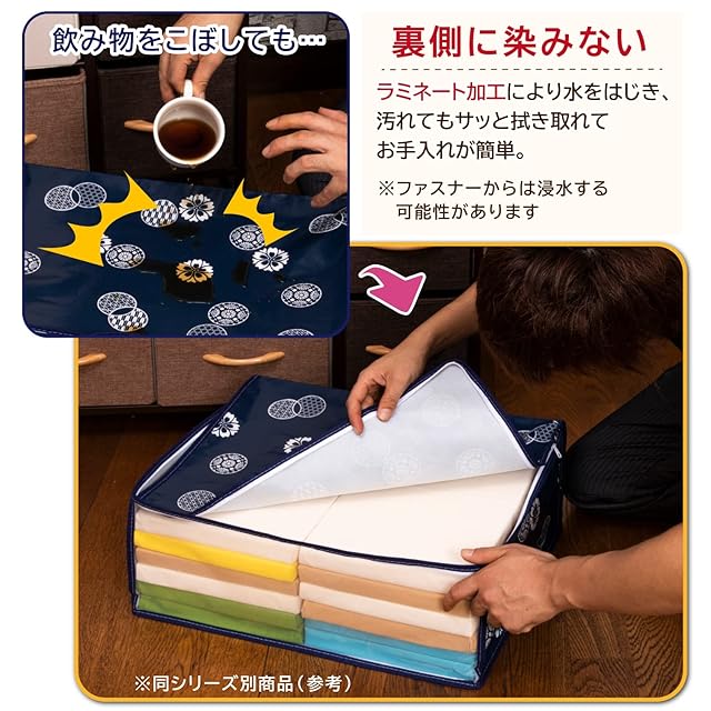 【商品仕様】:サイズ/約幅24×奥行11×高さ31cm、カラー/ネイビー、柄/和柄、内容/1個、収納目安/フェイスタオル程度のサイズのタオル:約6~12枚・ボックスティッシュ・ソフトパックティッシュ:約5~6個、材質/ポリプロピレン(ラミネート加工)・ポリエチレン