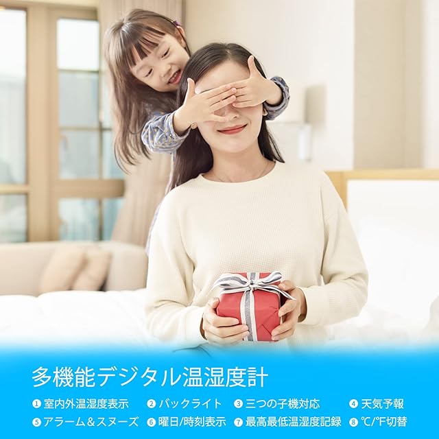 【独特なバックライト LCD大画面】小型ですが、見やすいLCD大画面を搭載しており、時計·日付·曜日·温度·湿度·天気予報は同時に表示でき、必要な情報は一目で確認できます。バックライトボタンを押すと、画面が明るくなります。夜中或いは暗いところでも確認しやすく、家族の健康管理、インフルエンザや風邪などの予防、お部屋の乾燥チェック、お肌の潤いを保つ、カビ対策や熱中症対策などに役立ちます。