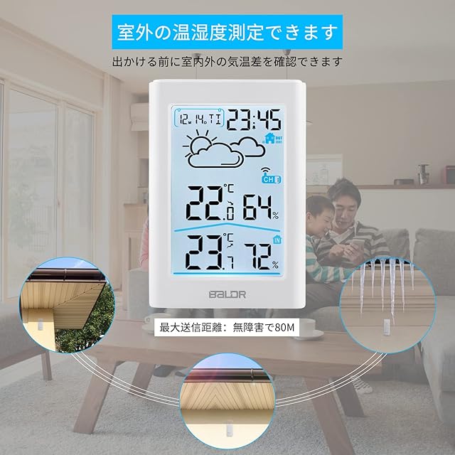 商品名:温湿度計 室内 室外 デジタル ワイヤレス 温度計 湿度計 外気温湿度計 高精度 天気予報 LCD大画面 バックライト 最高最低温湿度 温度湿度傾向図 華氏/摂氏表示 置き掛け両用 コンパクト 一つセンサー付き 乾燥対策 熱中症 赤ちゃん 年寄り 体調健康管理 アラーム&スヌーズ おしゃれ 日本語説明書