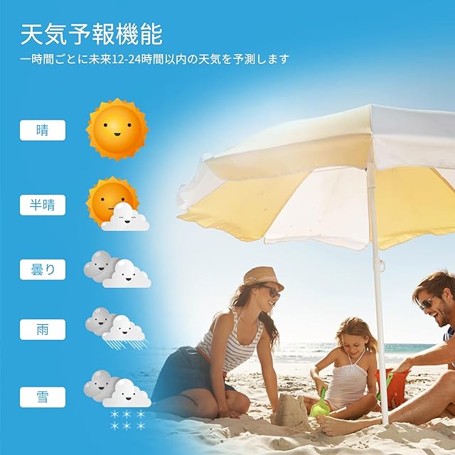 【天気予報機能搭載 多機能】室内外での温湿度測定するだけではなく、天気予報機能も搭載されました。5種類のアイコン(晴、半晴、曇り、雨、雪)で親機に表示され、天気情報は一目瞭然です。天気の変化をよく知り、より健康的な生活を楽しもう!天気予報情報は1時間ごとに更新されます。それに、24時間以内の最高最低温湿度も記録と表示が可能です。周りの環境変動につれて常に準備ができっており、専門家のようなあなたの健康を守ります。また、時刻&日付表示、12/24時間表示切替、アラーム&スヌーズ機能、C/ºF表示切替機能など何種類な機能も搭載しており、値段の割にしっかりしてます。