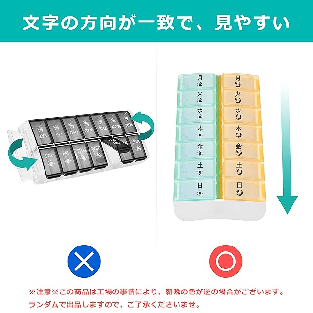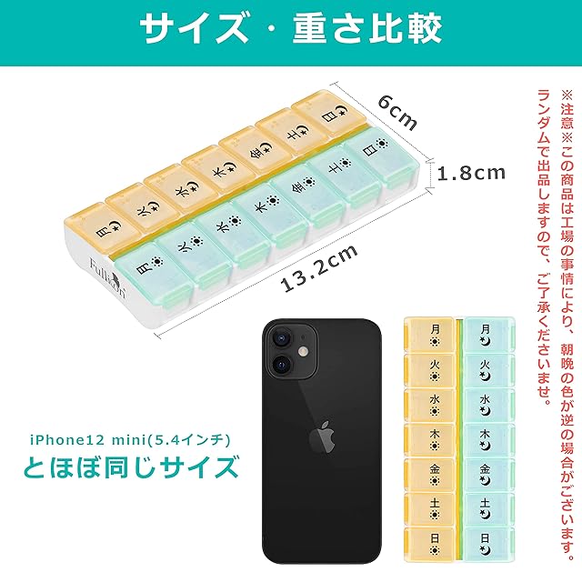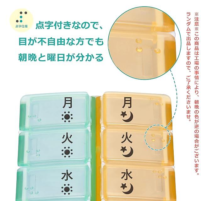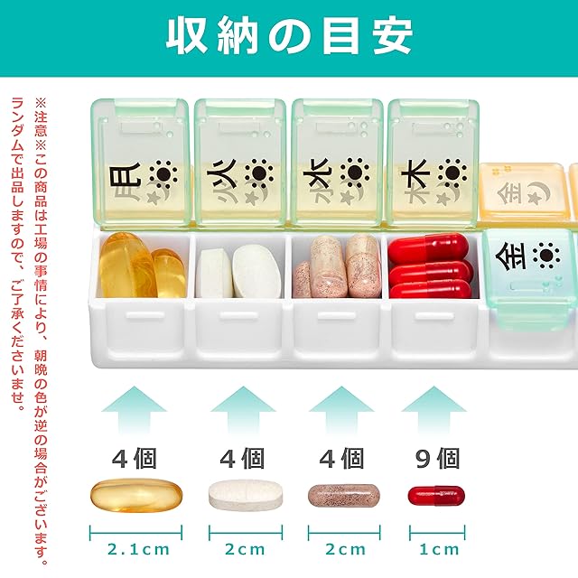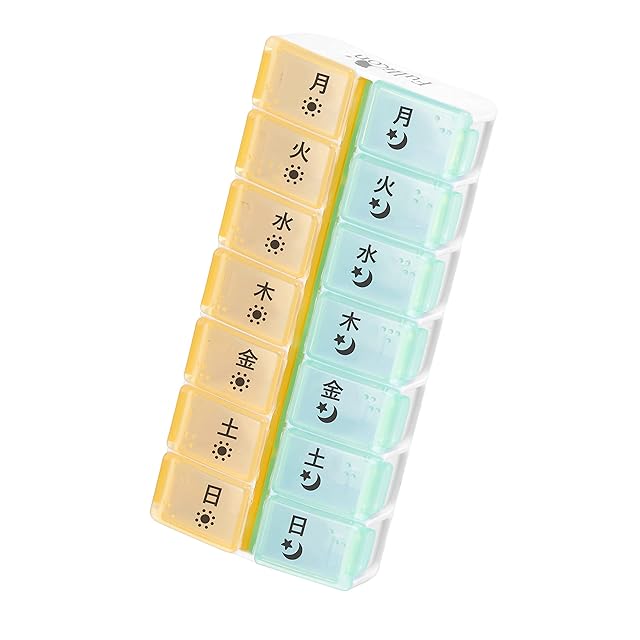 <p><strong>【商品紹介】</strong></p> <p>色:黄/緑</p> <p>サイズ:13.2 x 6 x 2 cm</p> <p>個数:1個</p> <p>重さ:42.6g</p> <p> </p> <p><strong>【商品特長】</strong></p> <p><strong> ※注意※この商品は工場の事情により、朝晩の色が逆の場合がございます。ランダムで出品しますので、ご了承くださいませ。</strong></p> <ul> <li>【縦式印刷】印刷方向が縦なので、曜日を見たい時にくるくる回さなくても、一目瞭然。</li> <li>【点字仕様】視覚障害者さんの気持ちを考え、点字を付けました。点字で曜日と朝晩が分けることができます。</li> <li>【薬が取りやすい】従来の箱の仕様は四角いが多く、底の薬が取りにくいです。ですが、この商品は薬の形に合わせてアーチ仕様となり、簡単に底の薬を取ることができます。</li> <li>【軽くて携帯しやすい】大きさはIPhone12miniより小さいし、重さは僅か43gです。それに密閉性が良く、かばんの中に勝手に開くことがございません。</li> <li>【飲み忘れ防止】朝晩の色が違い、いつ薬を飲むことが分かります。それに柄のデザインがまんまるでかわいらしくリニューアルしました。薬を飲むタイミングを注意してくれるだけでなく、見るたびに良い気分になります♪</li> </ul> <p> </p> <p><strong>【なぜ私たちはピルケースを使いますか?】</strong></p> <ul> <li>より簡単に薬を飲むことを覚えます</li> <li>薬を一か所に集中できます</li> <li>サプリメントをまとめられます</li> <li>旅行中に、より簡単にビタミンを保管します</li> </ul> <p>良いピルケースを見つけることができれば、あなたの生活をシンプルさせ、服薬コンプライアンスの成功率もアップさせます。</p> <p> </p> <p><strong>【使用方法】</strong></p> <ol> <li>使う前にきちんと洗ってください。</li> <li>初めて使う時、石鹸水で洗ってください。</li> <li>保管する前に乾かしてください。</li> </ol> <p> </p> <p><strong>【ブランド紹介】</strong></p> <p>Fulliconはピルケースや健康グッズを研究と開発がおよそ十年程で、大勢の人に愛されているブラントです。</p> <p>高品質なピルケースをご提供するため、Fulliconでは、「開発」「製造」「品質管理」「品質」の各部門が連携して品質を守ります。</p> <p>Fulliconはあなたの大切な人の暮らしをサポートし、長年信頼されているブランドです。</p> <p> </p> <p><strong>【生涯】</strong></p> <p>Fulliconで生産た全ての商品をいたします。</p> <p>180日期間内、通常の使用にも関わらず発生した、素材や製品構造の不具合や欠陥になる場合は、全て返金返品処理いたします。</p>