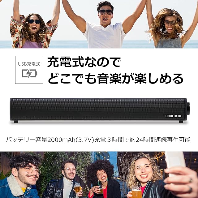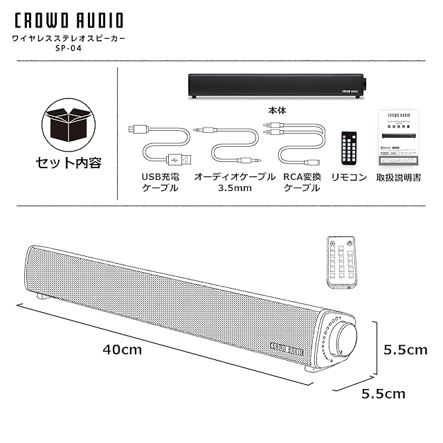 商品名:CROWD AUDIO マット加工 ワイヤレス スピーカー ステレオ SP-04 | Bluetooth 5.0 2000mAh リモコン付き PCスピーカー サウンドバー ゲーミング ハンズフリー 有線でも使用可 microSD ブラック