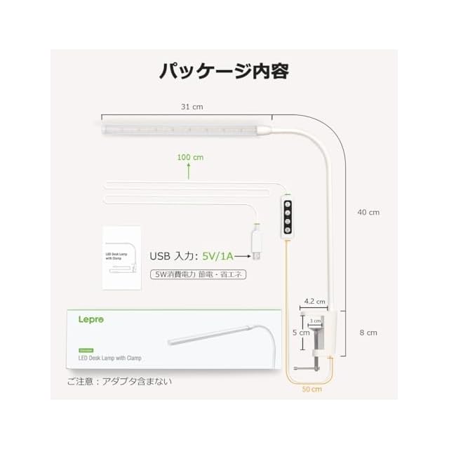 Lepro デスクライト クランプ led 目に優しい クランプライト スタンドライト 電気スタンド 【電球色・白色・昼光色/10段階明るさ/5W省エネ/Ra80演色/明るい/独立コントローラー制御/360°角度調整可能/USB給電式/1.5Mケーブル】 テーブルライト 卓上ライト 台灯 卓上照明 勉強机 学習机 ライト ブックライト 読書灯 (ホワイト) 電球色、白色、昼光色の3段階調色と10段階の調光機能が搭載され、使用シーンに合わせてコントローラーでお好みの色と明るさが変えられます。メモリー機能により、次回使用時に最後のモードと明るさが維持されます。明るさは最大460ルーメンとなり、他の製品より明るくて、作業や勉強などに最適です!自由に動かせるアームと回転クランプを採用しながら、グランプライトを360度広範囲で自由自在に動かせます。任意の角度に調整して、デスク上を照らすLEDライトの光を最適化になります。勉強、読書、ペインティングなどに細かい作業も安心です。組立ての際に工具は一切必要がない、クランプでLEDデスクライトは厚さ5cmまでのテーブルに気軽にしっかり固定することができます。クランプデザインにより、デスクのスペースを大幅に節約します。平面発光のデザインにより、多重影やムラなどの目に悪いものができにくいです。自然光に近く、演色指数80以上なので柔らかくて平均的に広がり、長時間の勉強や作業でも目が疲れにくく、子供にも大人にも目に優しいデスクライトです。クランプライトはUSB-Aポートに電源アダプタを接続するだけですぐに点灯します。高輝度ledチップを採用しており、消費電力は僅か5Wです。LEDライト自体の発熱も抑えられ、子供でも安心してご利用いただけます。