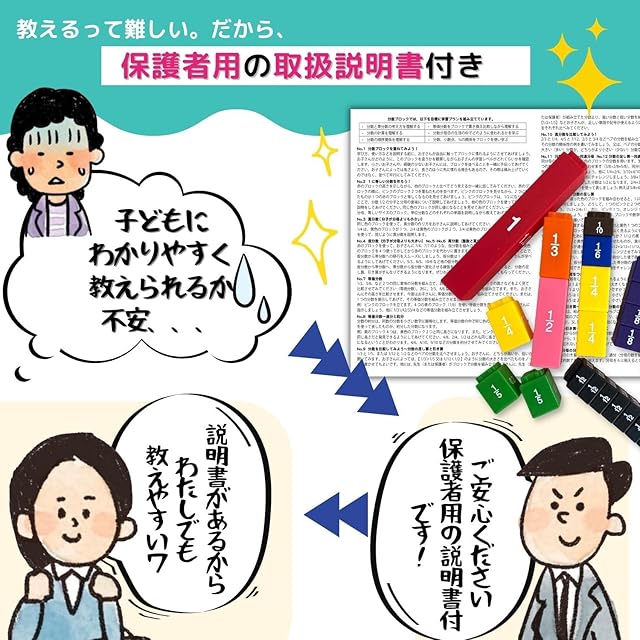【 お子様に合わせた学習 】 分数ブロックをご家庭での学習に活用していただくことで、お子様のペースに合わせた学習が叶います。しっかりと理解できているところはスキップして、わからないところは理解できるまで手と頭を動かしてみることで、より深い学習になります。また、学校では多くのお友達の中で授業が進むため、「?」と思っても先生に質問することができないことがほとんどです。年齢的にも質問が恥ずかしいという気持ちが始まります。ご家庭での予習・復習に、お子様ご自身がじっくりと考えられる、分数ブロックをお役立てください。 対象年齢:6歳以上