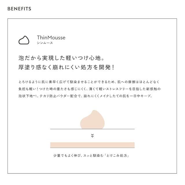 化粧崩れやテカリを防ぎ、化粧のノリとモチをアップ。泡状だから実現した厚塗り感なく軽いつけ心地で、自然にカバーしてトーンアップ。