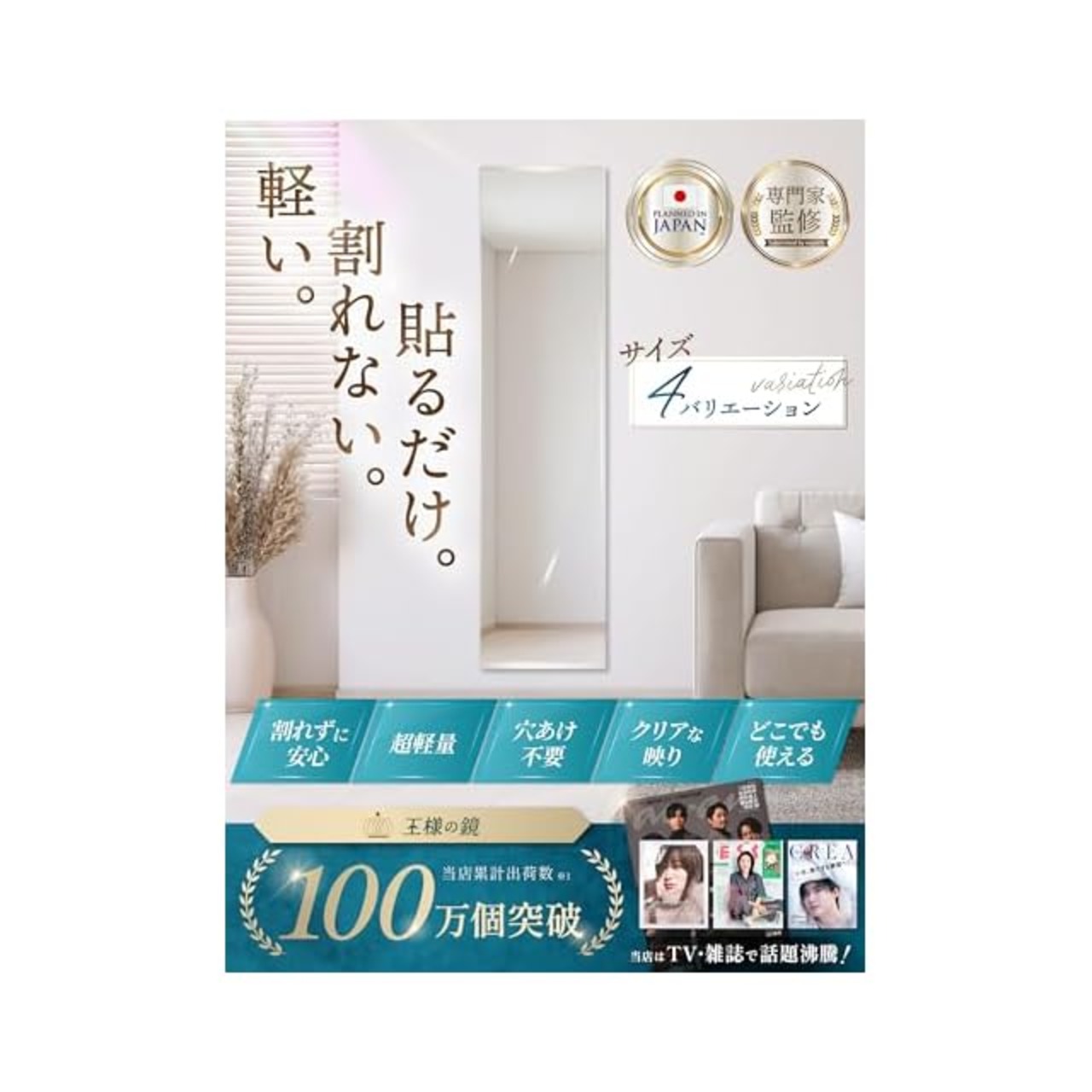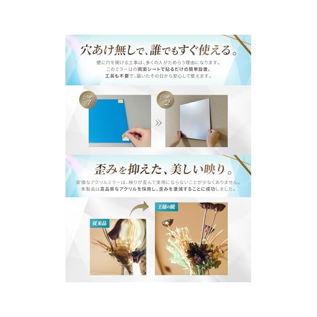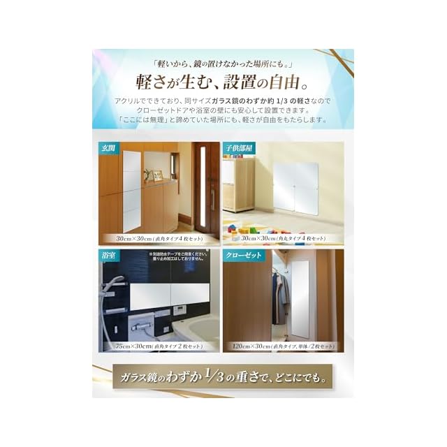 【使い方無限大】30cm×30cm4枚セット。縦に並べれば全身鏡に。ひし形でインテリアとして。一枚で髪型チェックなど配置次第で様々な使い方ができます。 【軽量で割れない鏡】アクリル製で割れない。飛散防止ミラーです。2mm厚でしっかりしているのに一枚当たり約170gと非常に軽量です。 【歪み超軽減】これまでのアクリル製鏡は通常のガラス製鏡に比べると極端に歪みがひどい物が多かったです。当製品は歪み軽減に徹底的にこだわり、近距離ではガラス製に近い感覚で使用可能です。 【安全安心】軽く落下しても飛び散ることが無いのでワンパクなお子様やペット、災害時にも安心です。お子様用施設やスポーツでのフォームチェックにも最適です。 【簡単貼付け】小型粘着シールで簡単に貼り付け。四隅をピンポイントで貼り付けるので、剥がす際もカンタンです。※テープは耐水性ではありませんので、別途耐水性のテープをご用意ください。 【安心サポート】日本メーカー製、サポートも日本人で安心。ご満足いただけなかったお客様は&返品も充実しておりますので安心してお買い求めください。