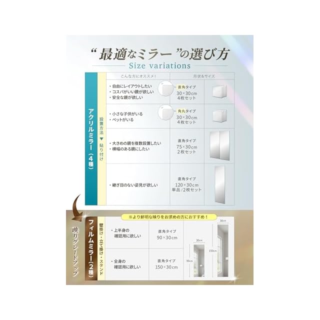 万が一、商品が破損して到着した場合は、お気軽にご連絡ください。 到着時に破損していたミラーについては、返品なしで全額返金または無料交換いたします。 ✅【諦めてませんか?】部屋が狭く、全身鏡を置くスペースが無い…そんな悩みを解決したい一心でBOOMIE「どこでも貼れる割れない鏡」は誕生しました。壁さえあればどこでも設置可能。出かける前に全身をサッとチェックできます。