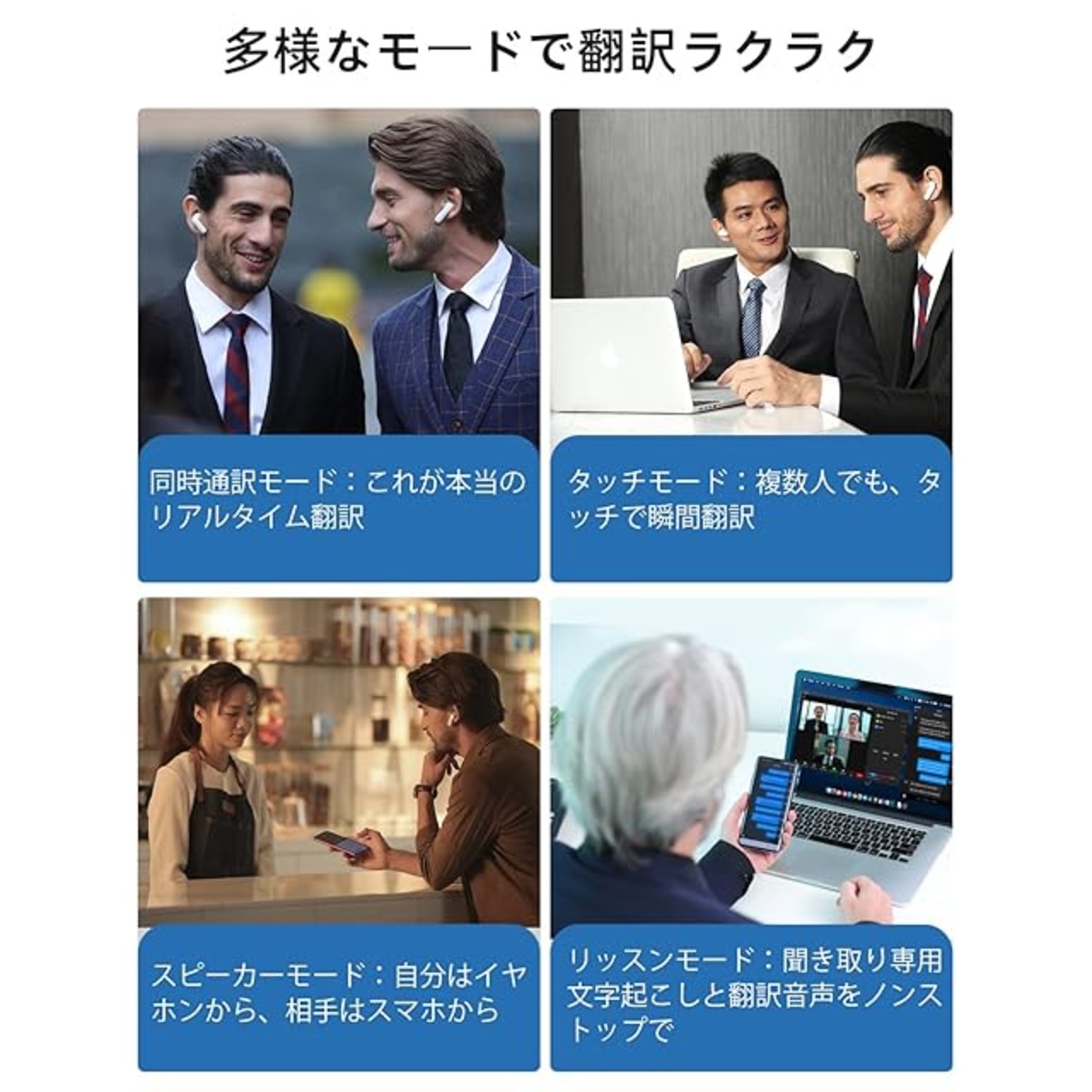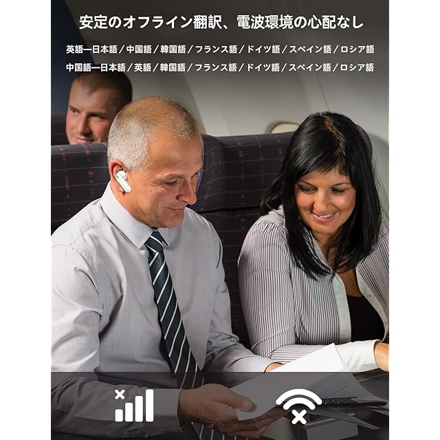 【4つのモードで楽々コミュニケーション】 リッスンモード:聞き取り専用モード。スマートフォンに向かって話してもらうことで、画面上には文字起こし、イヤホンには翻訳音声がノンストップで流れます。 タッチモード:イヤホンをタッチして話すと翻訳してくれます。話したい(翻訳したい)内容を確実に翻訳してくれます。 スピーカーモード:道を聞いたり、お店で注文したいときは、スマートフォンのスピーカーを使って会話ができます。 同時通訳モード:自分と相手がイヤホンを1つ着けて、あとは話すだけ。お互いの会話がリアルタイムに翻訳されます。