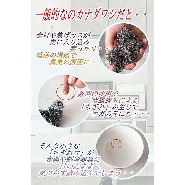細かく解れる事が無いので、金属片によるケガ、食器への付着なども起こり難く安心