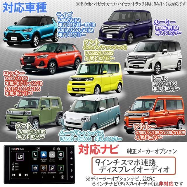 【対応ナビ】・トヨタ/ダイハツ純正メーカーオプション9インチディスプレイオーディオ または、9インチスマホ連携ディスプレイオーディオ対応