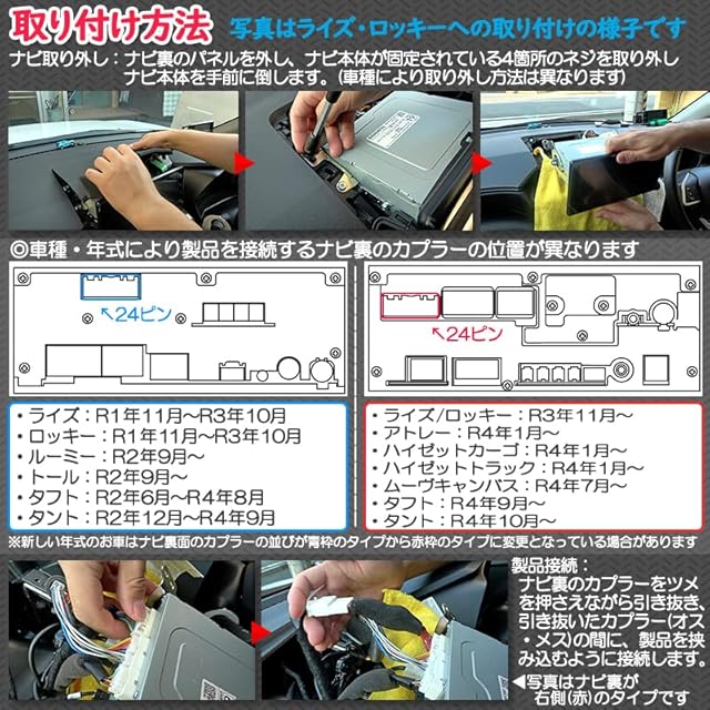 走行中にテレビHDMI経由の動画を視聴できるようになるハーネスキットです。商品はディスプレーオーディオユニット裏に取り付ける完全カプラーオン!<br> オートタイプでスイッチ等は不要です。<br> ○長距離ドライブ時に同乗者の方が退屈しないように、また渋滞でのイライラの解消に!!<br> ○じっとしているのがツライお子様がテレビやケーブル経由のHDMI対応機器の動画を見ることが出来るのでお車での移動が楽しくなります!!<br> ○完全カプラーオンで取付簡単!!ディスプレーオーディオの裏側の配線のコネクターの間に挟み込むだけ!!<br> 【対応ナビ】<br> ・トヨタ/ダイハツ純正メーカーオプション9インチディスプレイオーディオ<br> または、9インチスマホ連携ディスプレイオーディオ<br> 【対応車種】<br> ・ライズ<br> A200A/A210A 年式:R1/11~R3/10<br> A201A/A202A/A210A 年式:R3/11~<br> ・ロッキー<br> A200S/A210S 年式:R1/11~R3/10<br> A201S/A202S/A210S 年式:R3/11~<br> ・ルーミー<br> M900A/M910A 年式:R2/9~<br> ・タフト<br> LA900S/LA910S 年式:R2/6~<br> ・トール<br> M900S/M910S 年式:R2/9~<br> ・タント(カスタム含む)<br> LA650S/660S 年式:R2/12~<br> ・アトレー<br> S700V/S710V/S700W/S710W 年式:R4/1~<br> ・ハイゼットカーゴ<br> S700V/S710V/S700W/S710W 年式:R4/1~<br> ・ハイゼットトラック<br> S500P/S510P 年式:R4/1~<br> ・ムーヴキャンバス<br> LA850S/LA860S 年式:R4/7~<br> <br> 【商品内容】<br> ・配線キット<br> ・プラスチックリムーバー<br> ・取付説明書<br> <br> 【製品についての注意事項】<br> ・運転手の方は運転中に画面を注視は決して行わないで下さい。<br> ・本製品は純正メーカーオプション・ディスプレイオーディオ(9インチ)専用です。<br> ・製品を取付けても、問題なく車検に適合します。<br> ・取り付け等のサポートは承っておりません、ご自身のご判断でナビのお取り外し・お取り付けをお願いいたします。<br> 【注意事項】※今後、ナビのアップデートなどにより、製品が機能しなくなる可能性がございます。(2024/01/05記入)