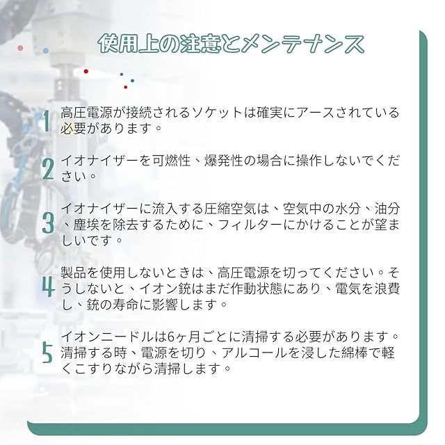 <b>【ご了承】</b><br> 弊店は家庭用の電子機材を提供できるように全力を尽くしており、 ユーザーに素晴らしいい体験をもたらすよう心から願っております。<br> <b>弊店はすべての製品に対して、一年間の期間をお提供しますので、</b><br> お客様にとっては、安心して購入できます。<br> ご不明な点がございましたら、どうぞお気軽にメールでお問い合わせください。<br> できるだけ早く返信いたします。<br> ご注文する前に、購入数量と製品仕様などの情報をもう一度チェックしてください。<br> ご注文が確認された後、弊社は約 2~7営業日以内に出荷いたします。</b><br>基本情報</b><br>銃本体:</b><br>入力電圧 :4.0KV AC</b><br>使用空気圧 :0.2Mpa-0.8Mpa</b><br>風量出力:[email protected],[email protected]</b><br>空気流量:10m/Sec</b><br>オゾン含有量:<0.03PPM</b><br>重量:0.55kg (銃本体)</b><br>素材 :アルミニウム</b><br>高電圧接続ケーブルの長さ:2.5m</b><br>----------------------------------- </b><br>高圧電源:</b><br>入力電圧 :110V AC/50HZ</b><br>パワー :20W MAX</b><br>消費電流 :≤2mA</b><br>出力電圧 :4.0KV AC</b><br>出力コネクタ:2個</b><br>重量:1.5㎏</b><br>イオンバランス :0±35V</b><br>ご注意:本製品を動作させるためには、8mmエアホースでエアポンプに接続するが必要です。
