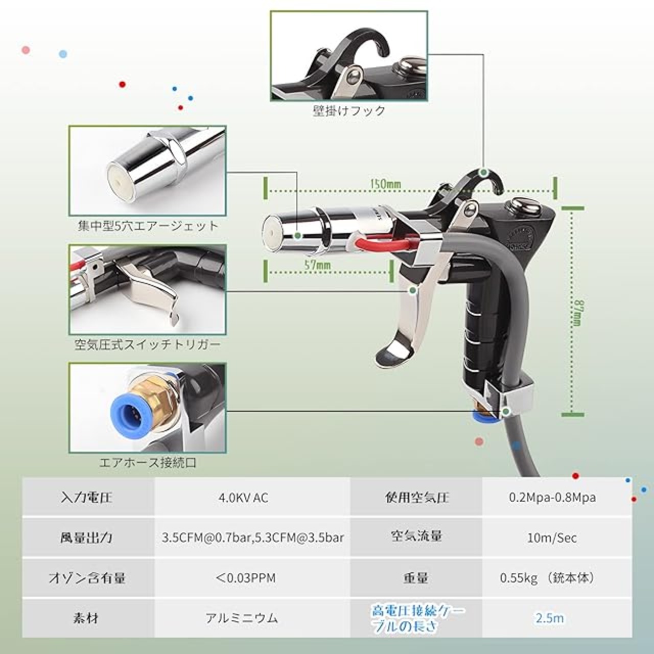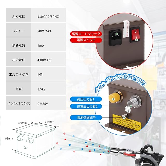 【製品仕様】入力電圧:110V AC/50HZ 出力電圧:4.0KV AC イオンバフンス:0士35V パワー:20W MAX 使用空気圧:0.2Mpa-0.8Mpa 高電圧接続ケ一ブルの長さ:2.5m 重量:わずか550g(銃本体)