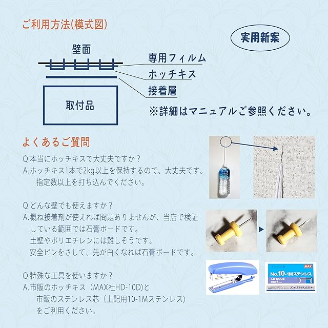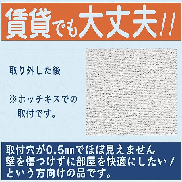 【壁の傷が目立たない】石膏ボードへの固定は壁紙の上から太さが0.5㎜のホッチキス針で固定するので、取り外した後も傷が目立ちません。壁紙に両面テープを貼ることもないので、壁紙が剥がれることもありません。(ホッチキス及び針は本品に含まれません)