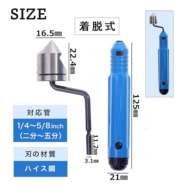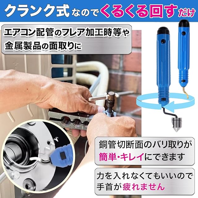 エアコンなどを取り付ける際の配管の工事などで、金属管の切断面のバリを除去できる面取りリーマー工具です。銅管などのフレア加工のバリ取り、他の金属製品の面取りにもお使いいただけます。</br>クルクルと回すだけで、簡単に短時間でバリ取りをすることができます。時間をかけてのバリ取りが不要となり、作業時間が短縮されます。</br>また、クランク型で素早く連続回転でき、手首が疲れません。</br>金属管の切断面に押し当てるだけでバリ取りができます。バリが内側に寝ることがなく、ナイフで加工したようなきれいな仕上がりです。</br>本品を工具セットに用意しておけば、スムーズにバリ取りを行うことができるので、配管工事をよく行うという方にもおすすめです。</br>寸法:リーマー部分 直径16.5mm 着脱式ホルダー部分 長さ12.5cm 幅2.1cm セット内容:リーマ径16.5mmタイプ + 持ち柄 ※ 刃先は非常に鋭利となっておりますので取扱には充分にご注意ください。