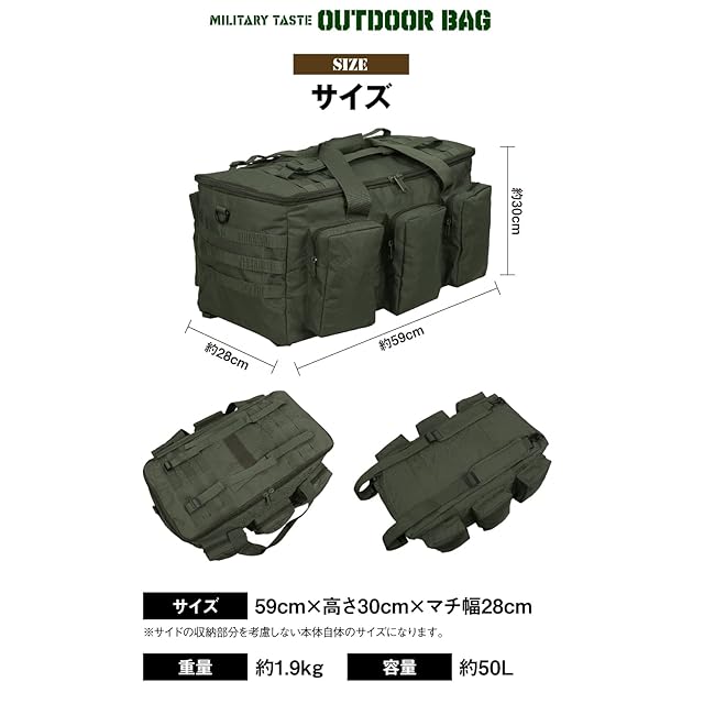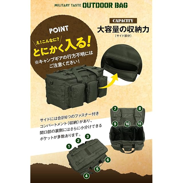 高い機能性:3WAY仕様、豊富な収納、素材など精錬された大収納のミリタリータイプのソフトコンテナ 。大小のアウトドアギアの収納はもちろん、そのほかとにかく荷物をたくさん運びたいときに大活躍するバッグです。