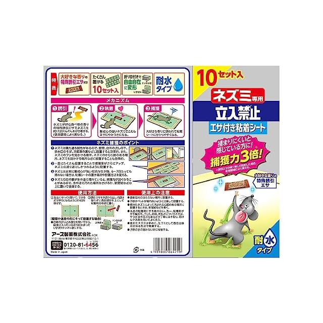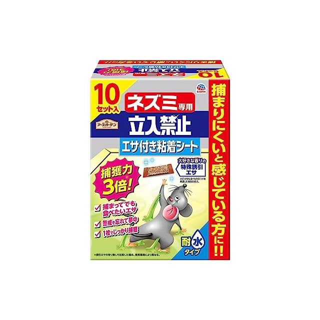 商品名:アースガーデン ネズミ専用立入禁止 エサ付き粘着シート 10セット入 防水タイプ 害獣対策 鼠 駆除 天井裏 床下 倉庫 玄関 庭 台所
