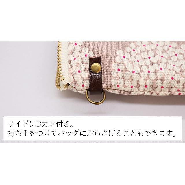 サイドに金具(Dカン)をお付けしていますのでそのままポーチとしても、持ち手を付けてバッグアクセサリーとしてもお使いいただけます。