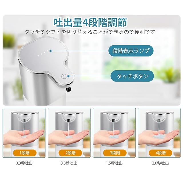 「四段階調節」4段階調節機能があり、自分に合った吐出量を選ぶことができる。スイッチを入れてタッチボタンに軽く触れ、ランプの数に応じて何段目かを確認します。各シフトの吐出量は0.3g、0.8g、1.5g、2.0gです。大人でも子供でも自分に合った吐出量を選ぶことができます。