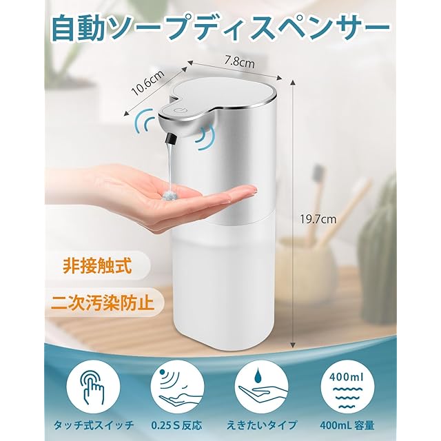 「自動ソープディスペンサー」。赤外線センサ技術を採用し、手をかざすと赤外線センサーが感知して適量のソープが自動的に出てきます。操作簡単、使用便利。汚れた手で直接ポンプに触る必要がないため、衛生的で、周りが汚れにくいです。非接触式で二回目感染を避けて、ウイルス予防の対策です。ご注意:赤外線センサーは濃色のスポンジを効果的に感知できない可能性があり、センサーの機能が失われたり、検出が不正確になったりすることがあります。