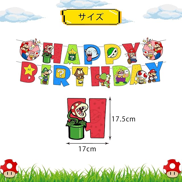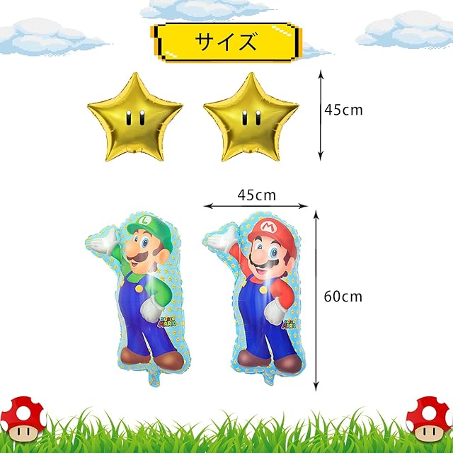 【バースデー飾り付けセット】HAPPY BIRTHDAYバナーx1、②ケーキトッパー(大きめ)x1、③ケーキトッパー(小さめ)x12、④バルーンx20、⑤マリオアルミバルーンx2、⑥スターアルミバルーンx2 【素材】風船セットは、無毒で無害、安全で環境に優しく、耐久性の高品質ある天然ラテックスで作られています 画像は高精細カラー印刷で、キュートでファッショナブルですこれをあなたの家族や友人にとって忘れられない瞬間にするのを手伝ってください可愛いバルーンがあり、お宅をもっと綺麗に飾り、その以外、パーティーの後に子供の部屋を持続に装飾できます 【HAPPY BIRTHDAYバナー】Happy Birthday バナーは高品質の紙で作られて、体に無害で、環境に優しいですね色付きのバナー文字をリボンで結びますとバースデーバナー間隔を調整し、好きなだけ長く保ちます 【適用場合】誕生日会だけでなく、サプライズパーティー、子ども会、子供の日、一歳二歳三歳の祝日祭り、体育祭、文化祭、保育園、幼稚園、ゲームセンター、主題店舗、部屋装飾にも適用しますどこでも飾り付けられ、簡単に雰囲気を盛り上げます