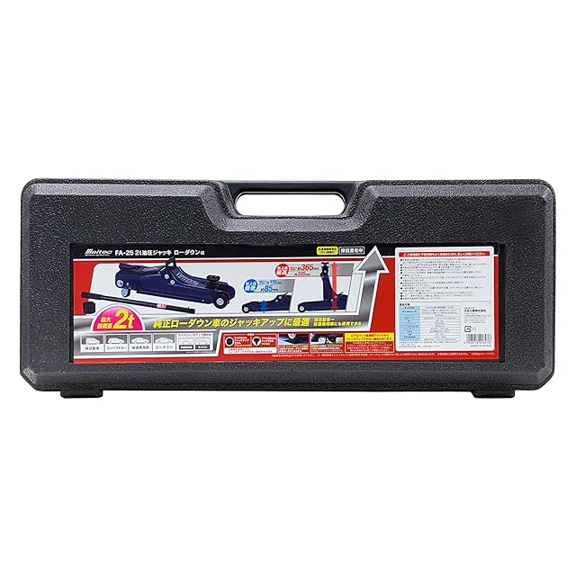 商品名:メルテック(meltec) 車用 油圧フロアージャッキ 2t ローダウンα 最高値/最低値 335(365)/85(115)mm ジャッキタッチメント・サドル(30mmUP)・ブローケース付 Meltec FA-25