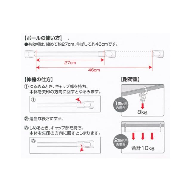 クロスフック使用範囲(鴨居サイズ):幅6~19cm、高さ2~5.5cm・ポール有効幅:27~46cm