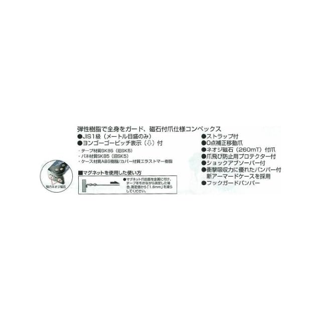 テープ材質 SK85(旧 SK5)、バネ材質 SK85(旧 SK5)、 ケース材質 ABS 樹脂/カバー材質エラストマー樹脂