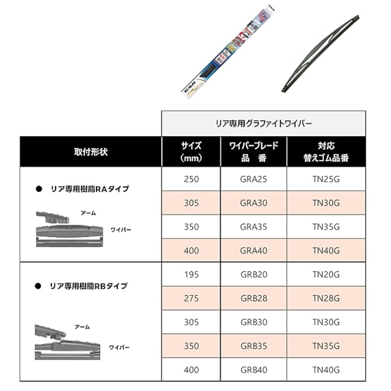 商品名:NWB(エヌダブルビー) 車用 リヤ専用グラファイト樹脂ワイパー ブレード 400mm RAタイプ GRA40