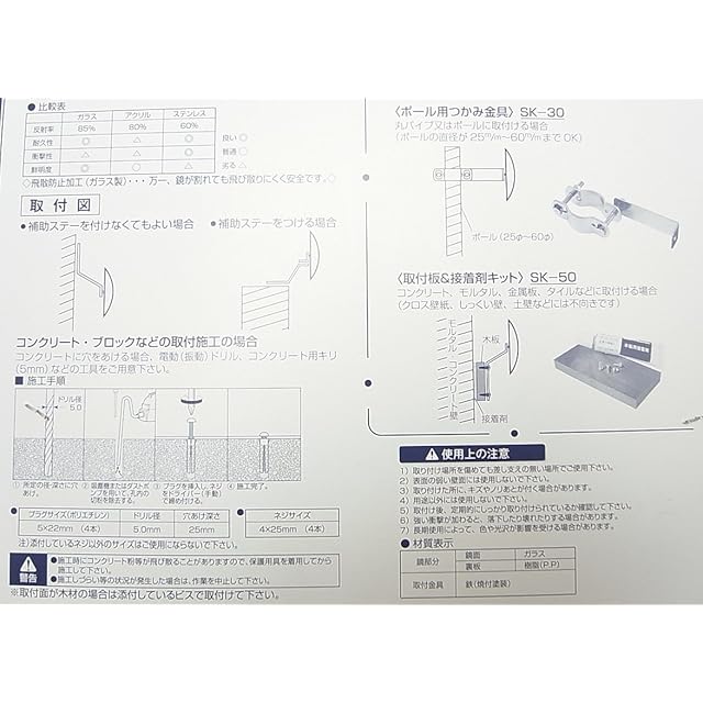 材質:鏡面 ガラス、裏板 樹脂(PP)、取付金具 鉄(焼付塗装)