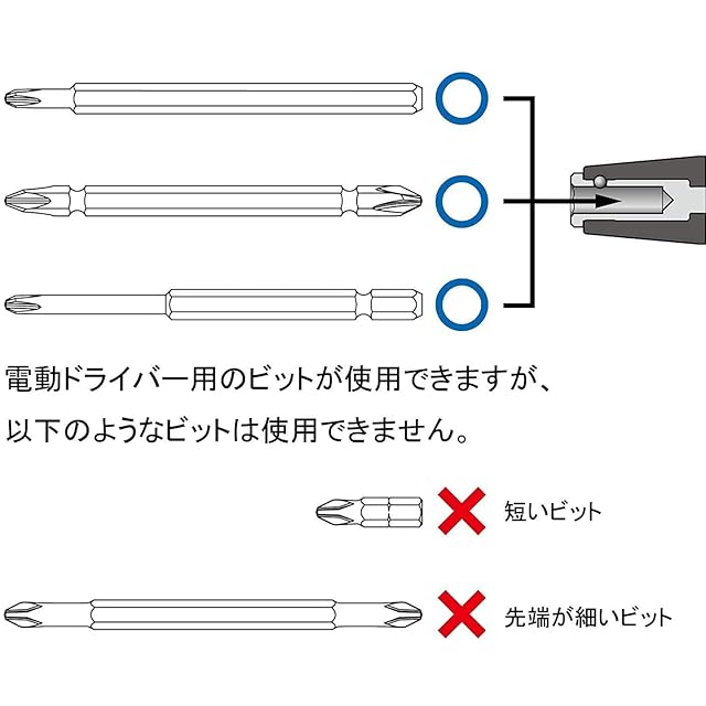 ビット差込口(mm):対辺6.35●先端:マグネット入り●グリップ:ポリプロピレン、エラストマー●ビット:工業用特殊合金鋼