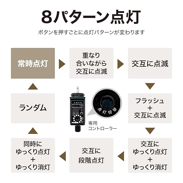 サンタクロースがやってきた。ワクワク気分を盛り上げるブローライト。ほのぼのとあたたかい気持ちにしてくれます。コントローラーの点灯切替ボタンを押すごとに合計8パターンの点灯が楽しめます。