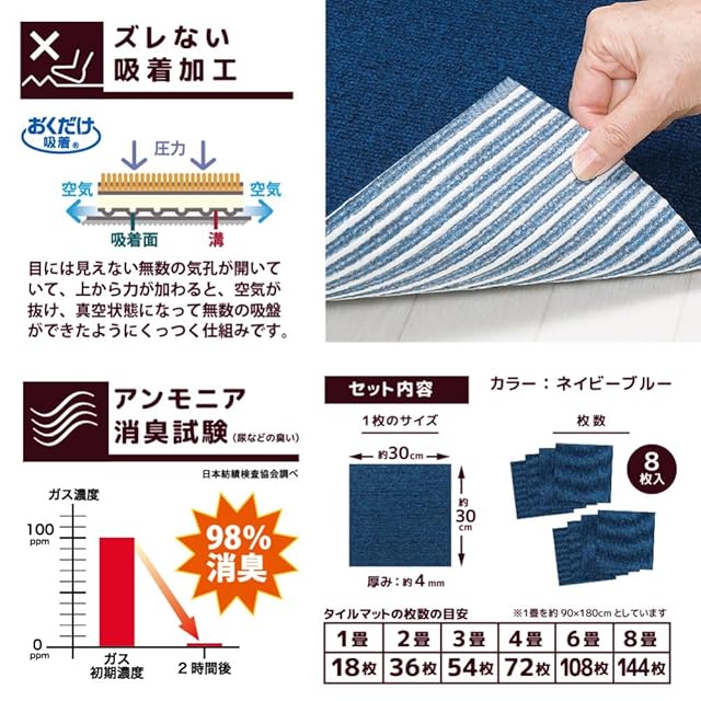 商品名:サンコー おくだけ吸着 獣医師推奨 ペット用撥水タイルマット 30cm×30cm 8枚入 ネイビーブルー 犬 猫 サンコー カーペット 【日本製 撥水 消臭 洗える ハサミでカット可】 KV-71