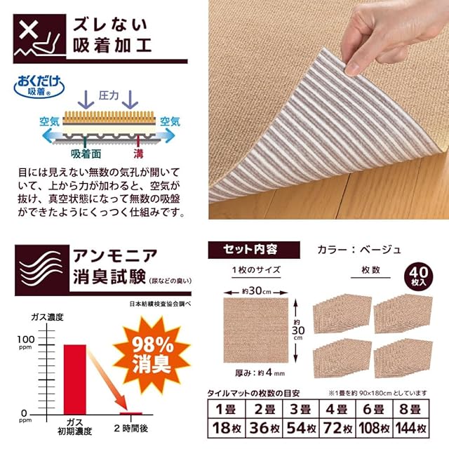 サンコー おくだけ吸着 獣医師推奨 ペット用撥水タイルマット 30cm×30cm 40枚入 ベージュ 犬 猫 サンコー カーペット 【日本製 撥水 消臭 洗える ハサミでカット可】 KP-56
