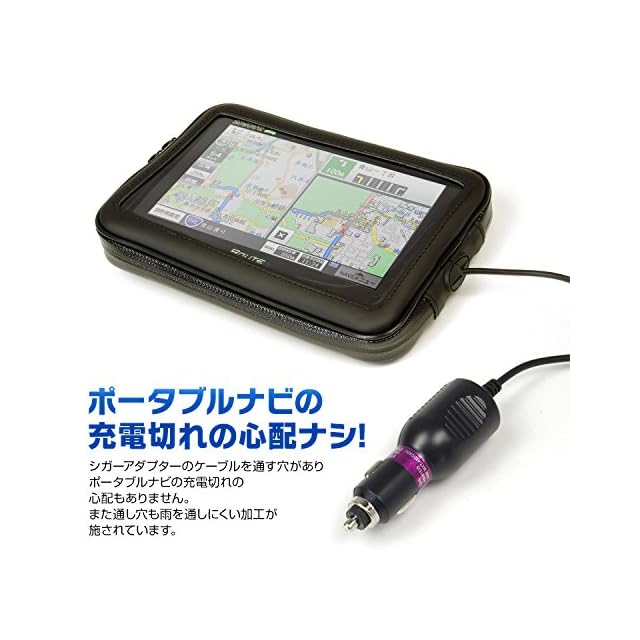 【ポータブルナビの充電切れの心配ナシ】 シガーアダプターのケーブルを通す穴がありポータブルナビの充電切れの心配もありません。また通し穴も雨を通しにくい加工。