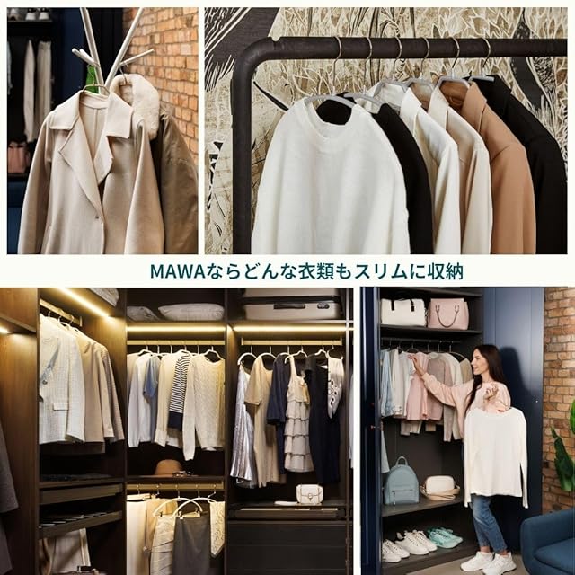 【すべらない】スチール製のハンガー本体はPVC樹脂で特殊コーティングが施され、掛けた衣類が滑り落ちません。人体のラインに合わせた立体構造のため、滑り落ちやすいカーディガンやニットも型崩れなく収納できます。