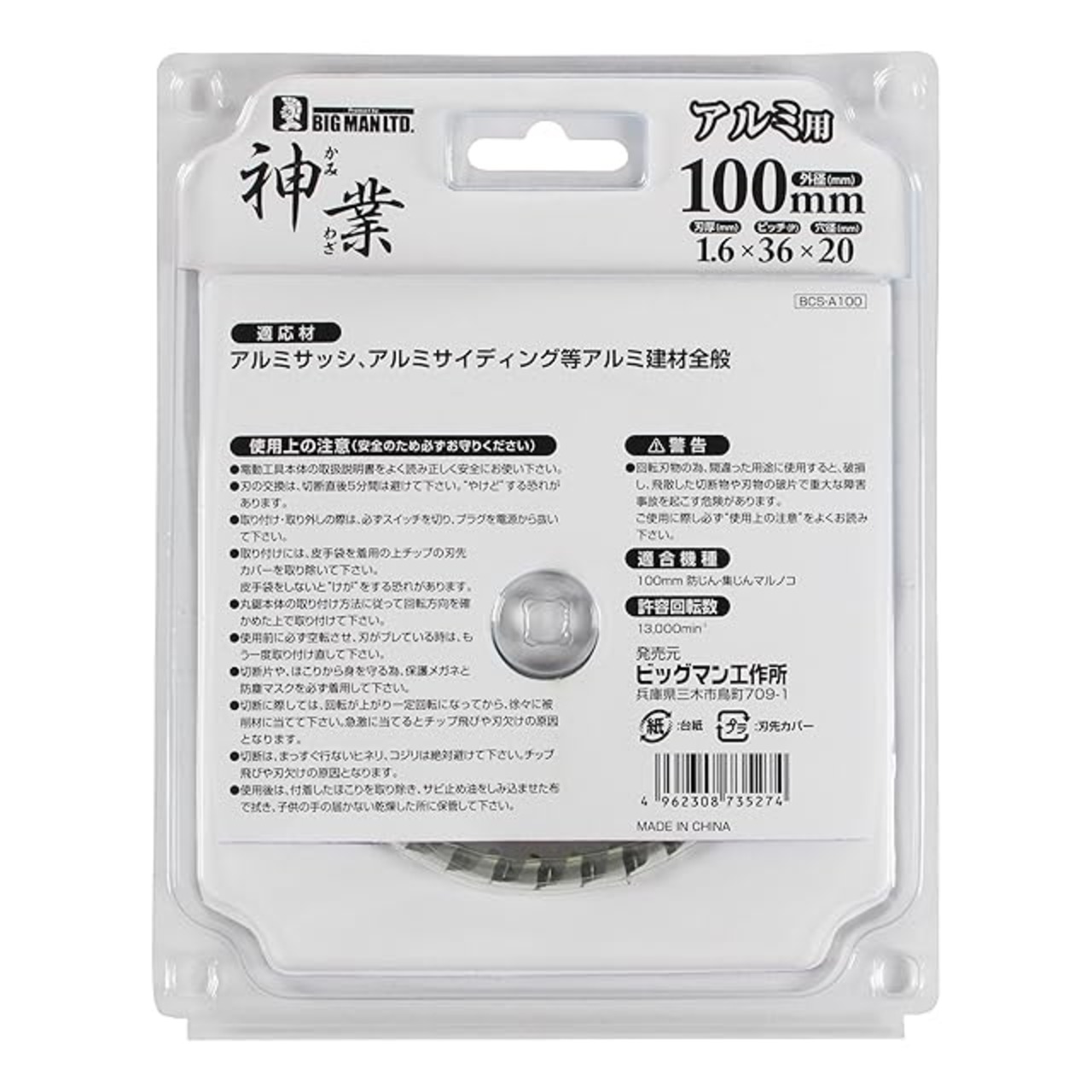 ビッグマン(Bigman) 神業チップソー 100mm アルミ用(アルミサッシ、アルミサイディング、アルミ建材全般) BCS-A100
