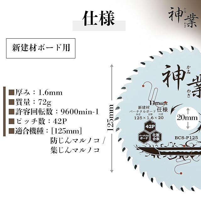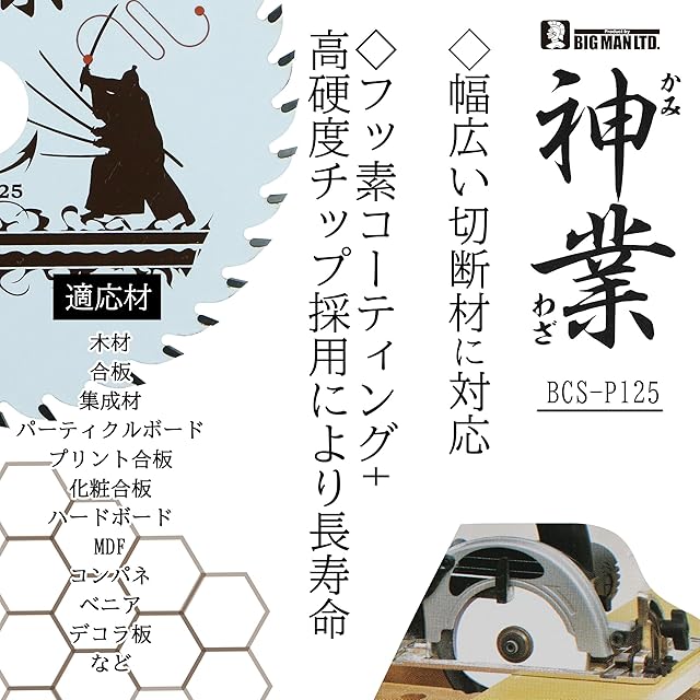 商品名:ビッグマン(Bigman) 神業チップソー 125mm 新建材・パーチクルボード用(木材、合板、集成材、パーチクルボード、プリント合板、化粧合板、ハードボード、MDF、コンパネ) BCS-P125
