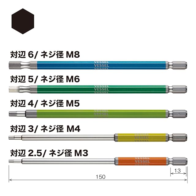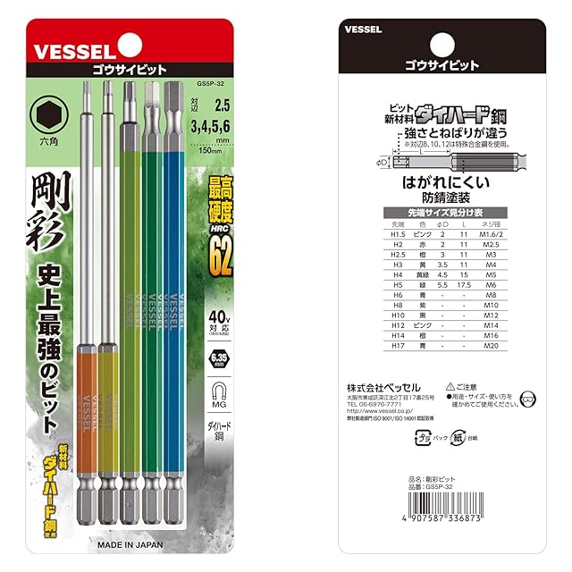 商品名:ベッセル(VESSEL) 40V対応 片頭ヘックス 剛彩ビット 5本組 対辺2.5/3/4/5/6×150 GS5P-32