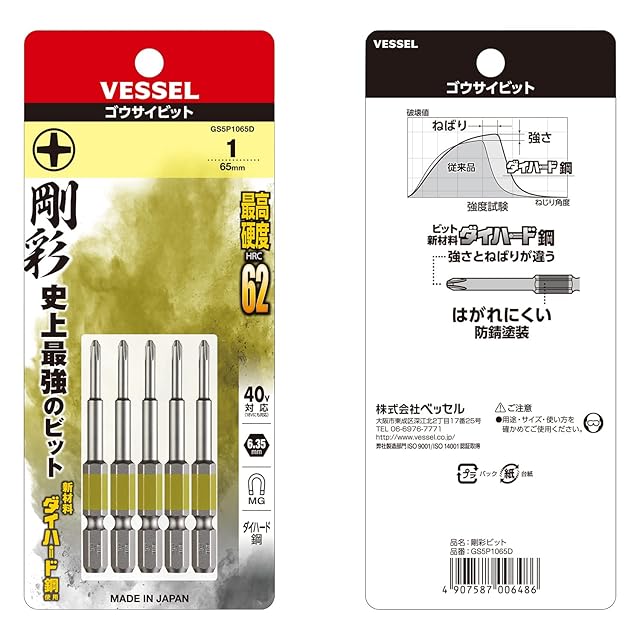 商品名:ベッセル(VESSEL) 40V対応 片頭プラス 剛彩ビット +1×65 5本組 GS5P1065D