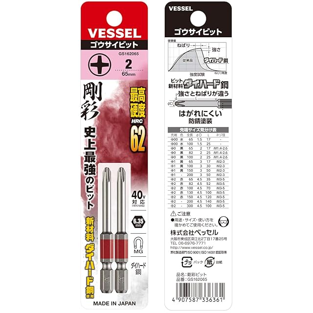 商品名:ベッセル(VESSEL) 40V対応 片頭 剛彩ビット +2×65 2本 GS162065