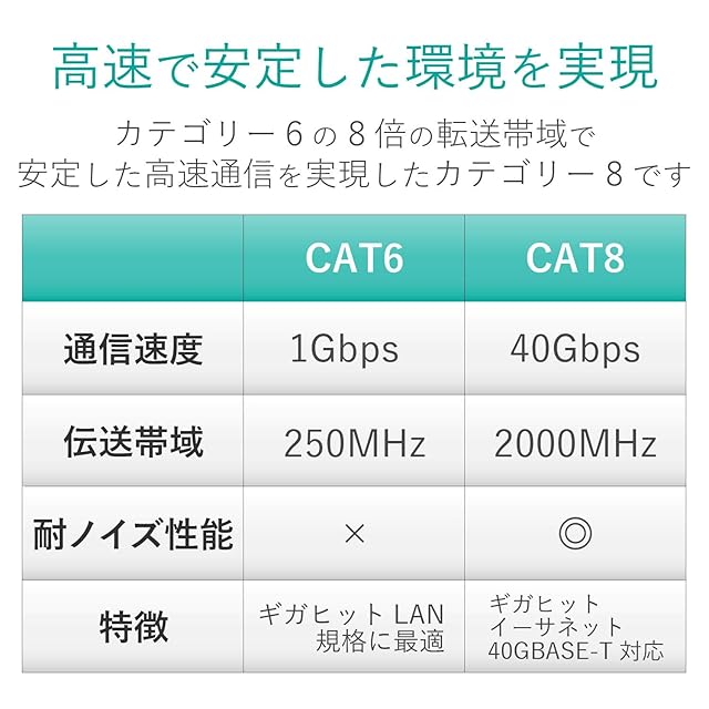 Cat6の8倍である2000MHzまでの高周波帯域まで対応しており、ノイズ干渉にも強く、高速で安定したネットワーク環境を実現します。