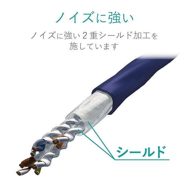 ギガビット以上の高速通信で起こりがちな、隣り合ったケーブル間でのノイズ干渉による通信エラー(エイリアンクロストーク)を防ぐ二重シールド構造を採用しています。
