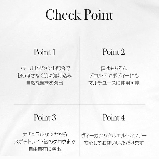 プロ仕様の極上のツヤ感 肌に溶け込むグローでダマにならず美しい輝きを実現します オフラ独自の【リキッド・トゥ・ベイク】を採用 超微細なメタリック光を放つ、唯一無二の輝き 【Point 1】 パールピグメント配合で粉っぽさなく肌に溶け込み自然な輝きを演出 【Point 2】 顔はもちろんデコルテやボディにもマルチユースに使用可能 【Point 3】 ナチュラルなツヤからスポットライト級のグロウまで自由自在に演出 【Point 4】 ヴィーガン&クルエルティフリーで安心してお使いいただけます